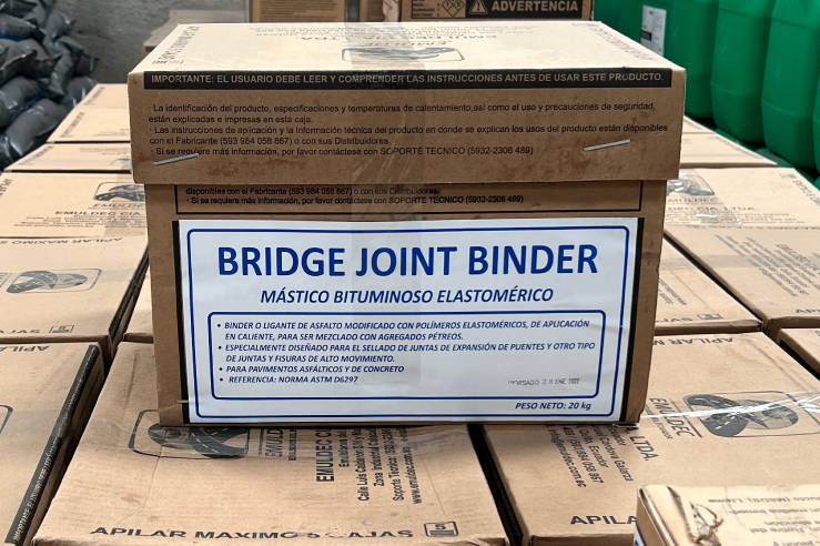Es un producto compuesto de asfalto modificado con un alto porcentaje de polímeros elastoméricos, caucho sintético y aditivos de adherencia que está diseñado exclusivamente para ser utilizado como Ligante Asfáltico en la producción de mezclas de alta calidad para el llenado y sellado de juntas de dilatación de gran dimensión. También sirve para reparar huecos (bacheo), fracturas, fisuras y deterioros en pavimentos de concreto y asfálticos. Por su alta calidad y elasticidad, es especialmente efectivo en el sellado de juntas de expansión, uniones o áreas deterioradas de puentes. Ideal para ser utilizado en reposición de carpetas asfálticas que han sido afectadas por trabajos utilitarios de alcantarillado, agua potable, telefonía, etc. BRIDGE JOINT BINDER ha sido formulada para ser utilizada en ambientes climáticos diversos.