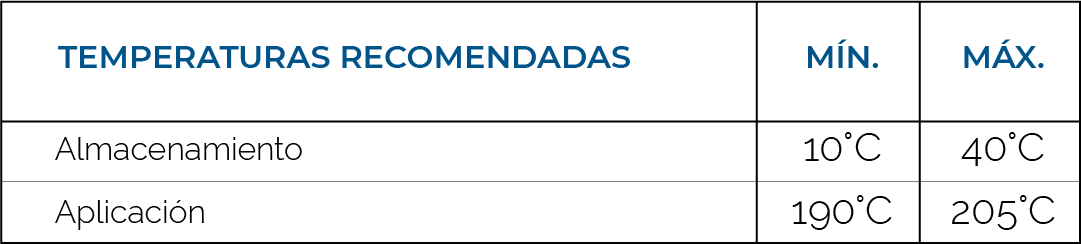BRIDGE JOINT BINDER, Mástico Bituminoso Elastomérico, es un producto basado en hidrocarburos y contiene productos volátiles. Si se aplica en lugares cerrados, deberá proveerse la suficiente ventilación. BRIDGE JOINT BINDER es un sistema químicamente estabilizado, por lo que se debe tener cuidado en no alterar ese sistema con contaminación con otros químicos, sobre exposición al aire o condiciones mecánicas o térmicas adversas. Se recomienda almacenar bajo sombra y protegidos de la lluvia. Antes de almacenar el producto, los sitios de apilamiento deberán ser examinadas y asegurar que no se encuentren posibles contaminantes. Las temperaturas recomendadas para su almacenamiento y su utilización se dan en la siguiente tabla: