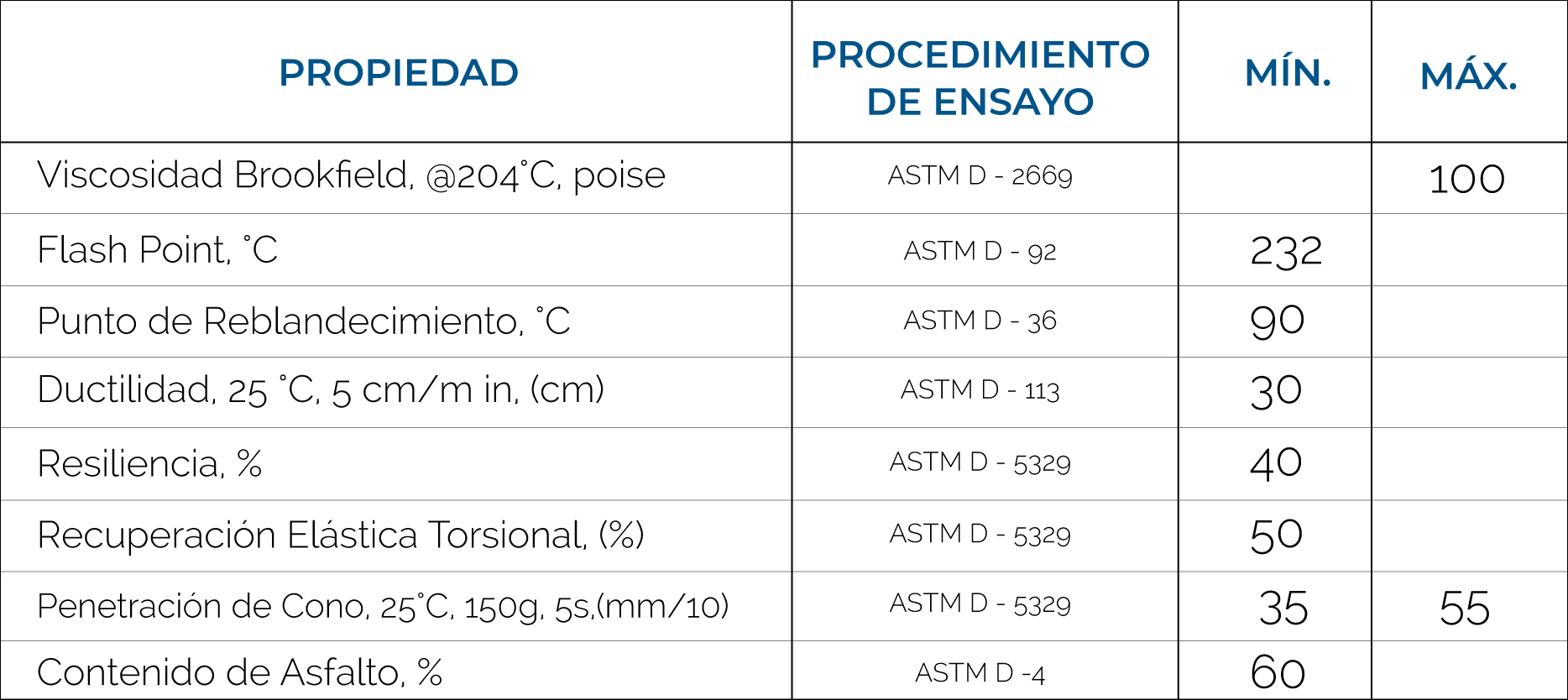 - Propiedades Físicas: Designación: Asfalto Modificado con polímeros elastoméricos SBS, SEBS y Otros.