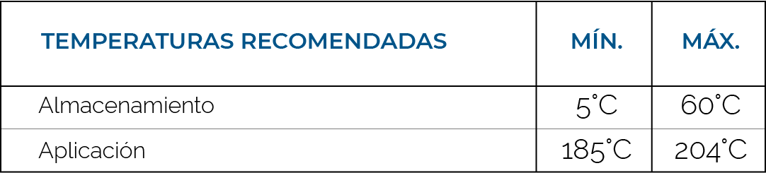 Sellaflex es suministrado en forma sólida en cajas siliconadas de 20 kg. Este producto cuando se funde en las temperaturas recomendadas y se aplica en forma correcta, forma un compuesto muy adherente y flexible, que resiste el agrietamiento en el invierno y resiste el flujo en las temperaturas del verano, siendo ideal para utilizarlo en cualquier zona climática. El producto es un sistema químicamente estabilizado, por lo que se debe tener cuidado en no alterar ese sistema con contaminación con otros químicos, sobre exposición al aire o condiciones mecánicas o térmicas adversas. Antes de ser cargados a las máquinas de aplicación, éstas deberán ser examinadas y asegurar que no se encuentren posibles contaminantes. Las temperaturas recomendadas para su almacenamiento y su utilización se dan en la siguiente tabla: